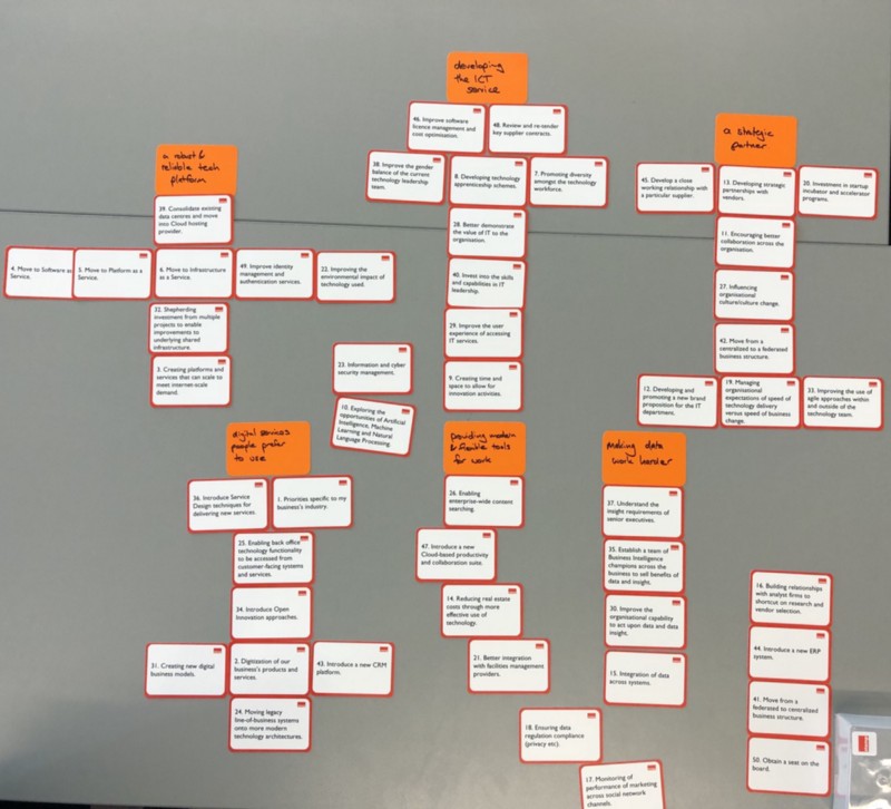 (The cards are based on common priorities that Matt’s distilled from conversations with CIOs across the public and private sectors. We looked at how these might map to the themes we’re using to shape our work at Hackney and also picked out ones that aren’t aligned with things we want to focus on – the ones at the bottom right. It’s not a perfect fit but I thought it prompted some interesting things to think about in terms of how the themes and our team structures link up.)